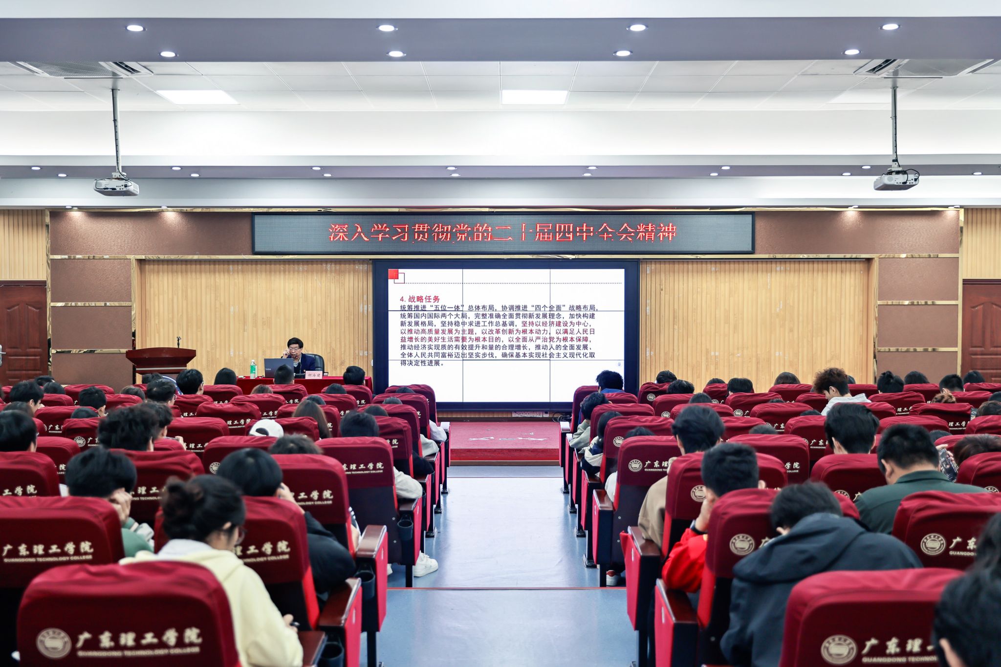 本网讯(新闻中心)为深入学习贯彻党的二十届四中全会精神,切实把全校党员干部师生的思想和行动统一到全会精神上来,12月5日,学校党委胡海建书记在高要校区42栋101举办宣讲党的二十届四中全会精神,信息技术学院师生参加本次宣讲会。从“十四五”时期我国经济、科技、综合国力的显著跃升,到全面建成小康社会的历史性成就,再到科技攻关、国防建设等领域的突破性成果,胡海建书记带领师生重温了国家发展的辉煌五年。同时,胡...