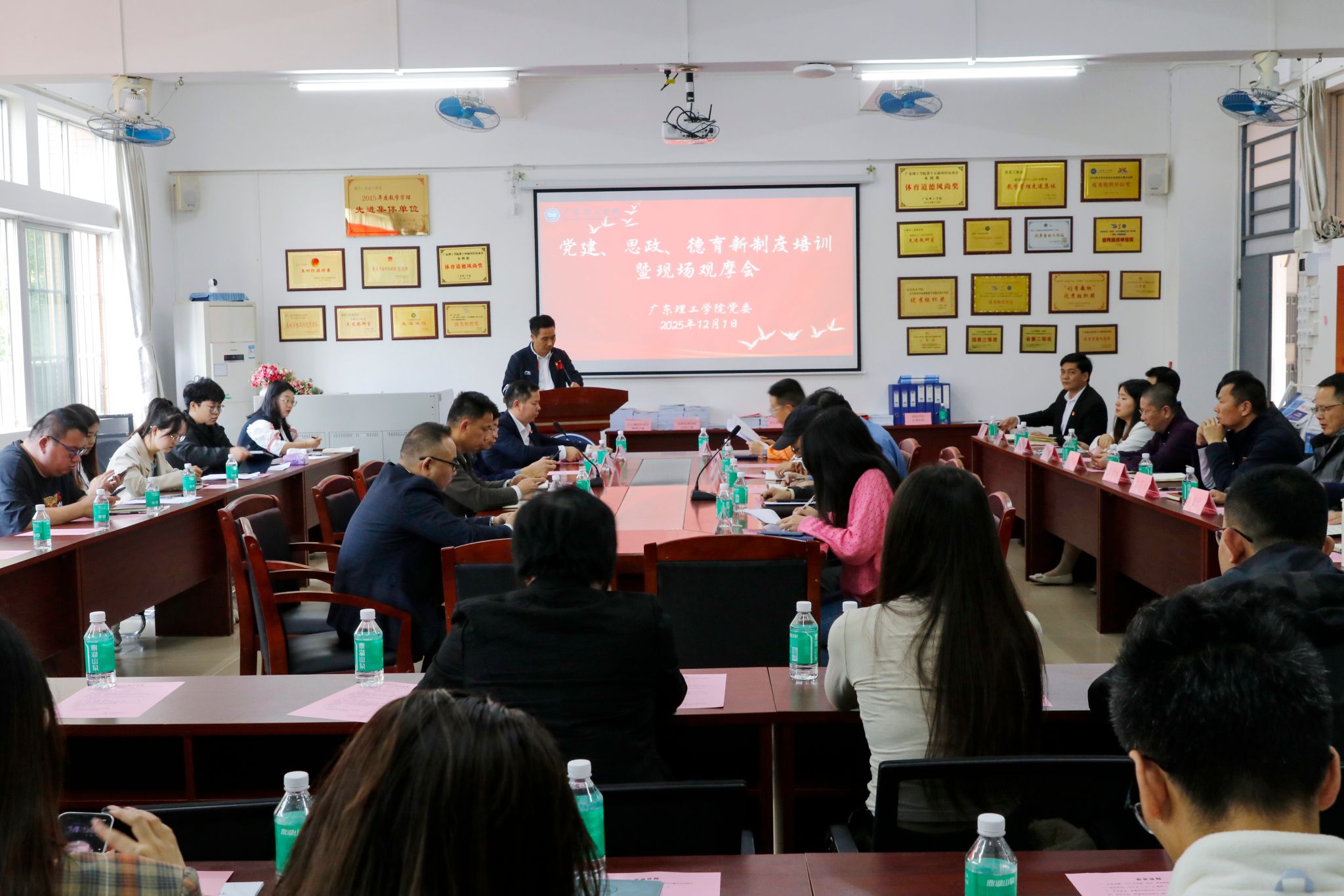 本网讯(党委办公室)12月1日下午,学校在高要校区振华楼42203会议室召开党建、思政、德育新制度培训暨现场观摩会。学校党委书记胡海建,党委副书记张宗珊、黎会友出席,党委组织部部长黎伯毅主持会议。参会人员覆盖校院两级核心力量,包括党委办公室、党委组织部等职能部门负责人,以及各二级学院党委书记、党务工作材料代表。会议以“制度培训+现场观摩”模式推进。黎伯毅部长介绍与会人员并阐明会议目标,随后党委办公室、党...