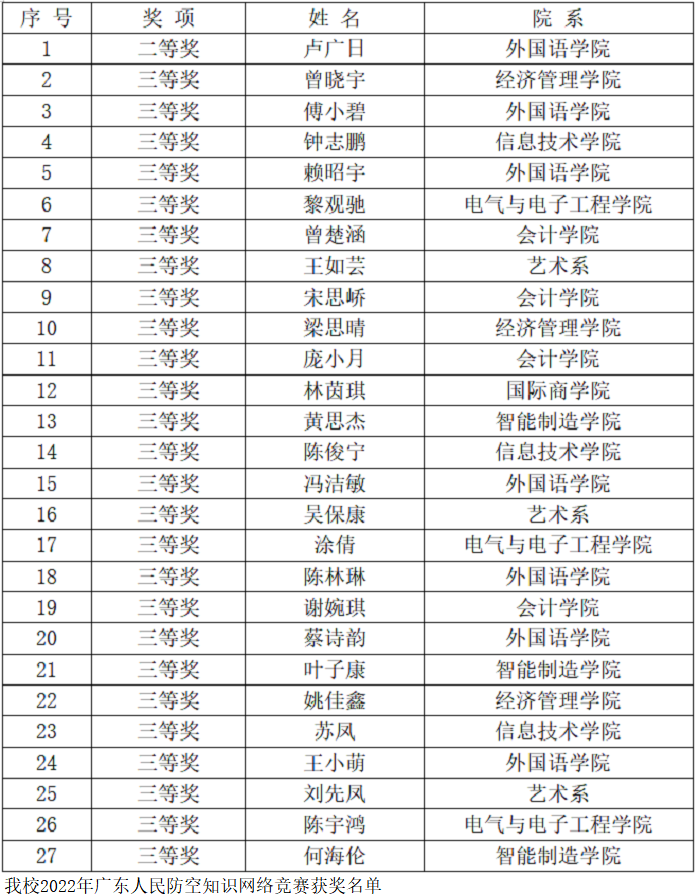 本网讯(保卫处 王翼飞)近日,由广东省教育厅、广东省人民防空办公室、广东省全民国防教育中心与南方+等四家单位共同组织举办的“2022年广东人民防空知识网络竞赛”在广东国防公众号上公布竞赛结果。beat365官网成绩突出,荣获“优秀组织奖”,总积分排名全省第12名;曾荫初、王翼飞2位老师获“优秀指导老师”,卢广日同学获二等奖,曾晓宇等26位同学获三等奖。为推动人民防空知识宣传教育全面展开,beat365官网以人人参与为目标,由保卫处第...