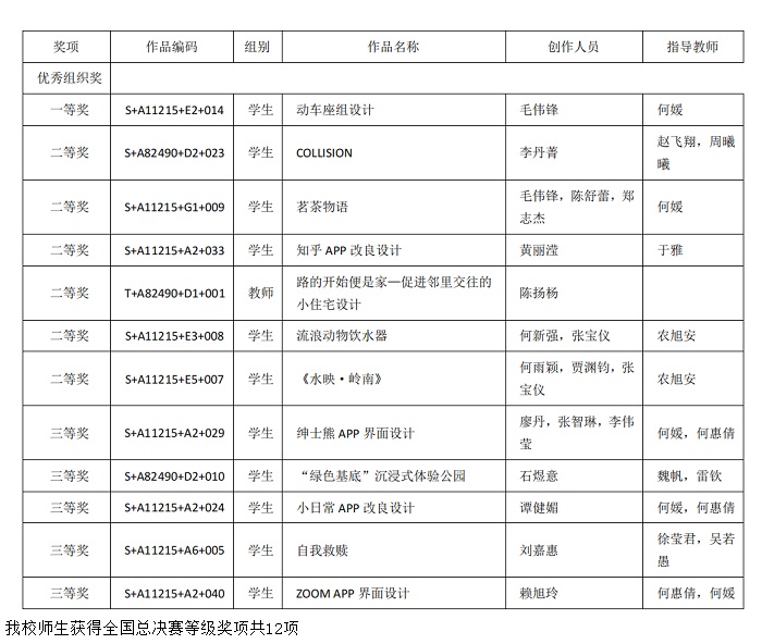 本网讯(宣传部 杨丽莎)近日,2022第十届未来设计师·全国高校数字艺术设计大赛(NCDA)全国总决赛获奖名单揭晓,beat365官网师生获得等级奖项共12项,其中一等奖1项,二等奖6项,三等奖5项。beat365官网荣获“优秀组织奖”称号。 该大...