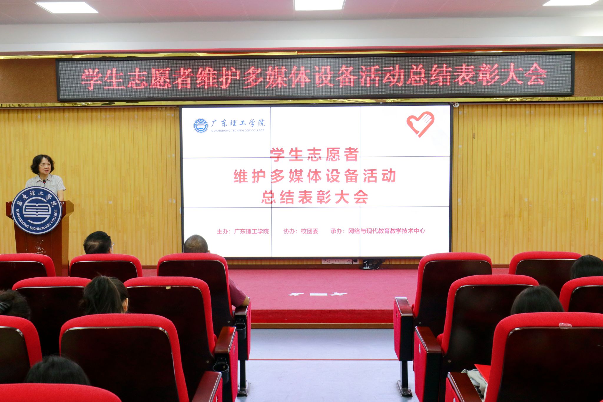 本网讯(新闻中心)2024年11月12日晚上19:00,beat365官网在高要校区振华楼学术报告厅隆重举行学生志愿者维护多媒体设备活动总结表彰大会。常务副校长柴维斯,党委学生工作部长、学生处处长谢桂袖,校团委副书记邢媛满,网络与现代教育技术中心主任胡致杰,网络与现代教育技术中心副主任梁锦孟、陈志成出席。胡致杰介绍了活动的基本情况,包括参与志愿者人数、服务次数、时长以及巡查维护教室数量,肯定了志愿者们在活动中诠释的志愿...