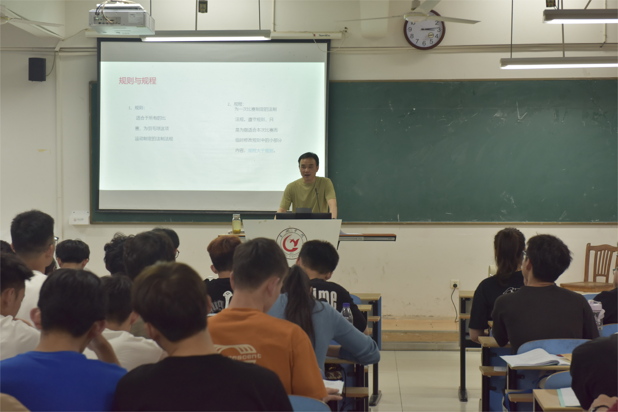 随后由安徽省羽毛球协会裁判委员会主任、羽毛球国家级裁判员易明兵,安徽省羽毛球协会裁判委员会副主任、安徽师范大学硕士生导师杨向明两位老师共同授课。两位老师从专业角度出发,深入浅出地向学员们介绍了羽毛球竞赛编排法、竞赛规则、临场执裁方法等一系列的裁判知识。