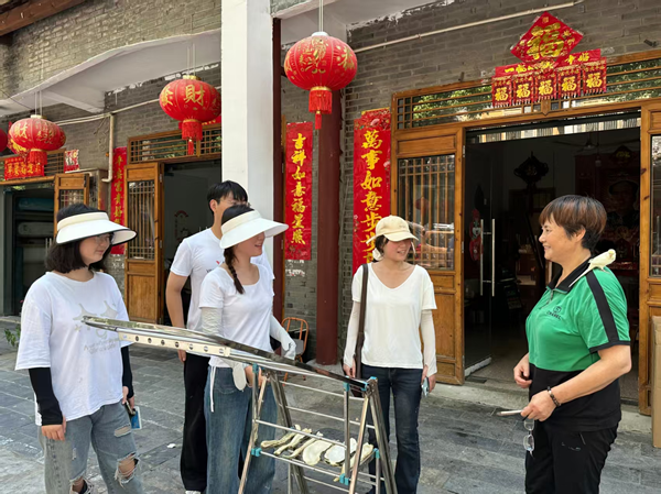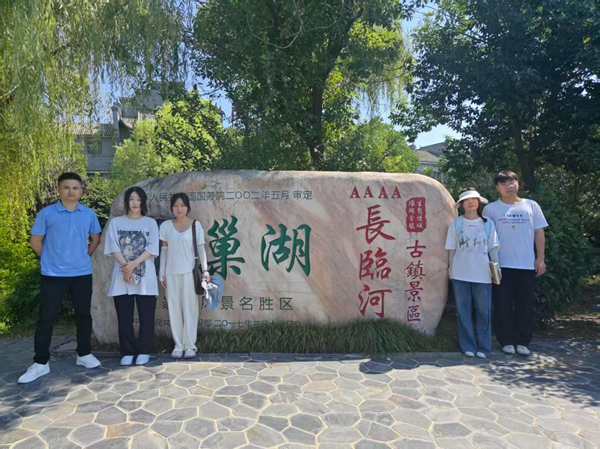 7 月 4 日清晨,采风团首站抵达巢湖市柘皋镇。踏着被岁月磨亮的青石板路,团队成员逐一探访玉栏桥、会通桥等明清古桥 —— 桥身斑驳的石雕纹饰里,藏着昔日漕运码头商船云集的盛景;拱桥倒映的水面上,晃动着古镇千年未变的生活节奏。在柘皋老街与李鸿章当铺等历史遗址,师生们一边用镜头定格砖雕木刻的精巧细节,一边围坐于老茶馆,听当地匠人讲述“柘皋早茶” 的制作技艺、民间扎制手艺的传承故事。