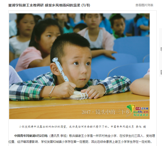 让他印象最为深刻的是,这期间他联合了几支团队共赴巢湖市散兵镇谢王小学开展支教活动。谢王小学是一所农村完全小学,在校学生约三百人,受地理位置、经济等因素影响,学校发展和城镇小学存在着一定差距,因此在综合素质上谢王小学学生存在一定劣势。志愿者们急孩子们之所需,为他们带去了绘画、音乐、舞蹈、剪纸、安全教育等素质拓展课程。讲台下,一个小小的孩童瞪大了双眼,目不转睛地盯着台上的志愿者老师,手里的铅笔不停地在便签本上记着……那一刻,李旭的内心分明被一种叫做“感动”的东西触动了——他分明感受到了乡村孩子们对素质拓展课程的喜爱!随着单反相机“咔嚓”一声定格的不仅仅是那张照片,这一幕在支教活动结束后一直浮现在他脑海里。